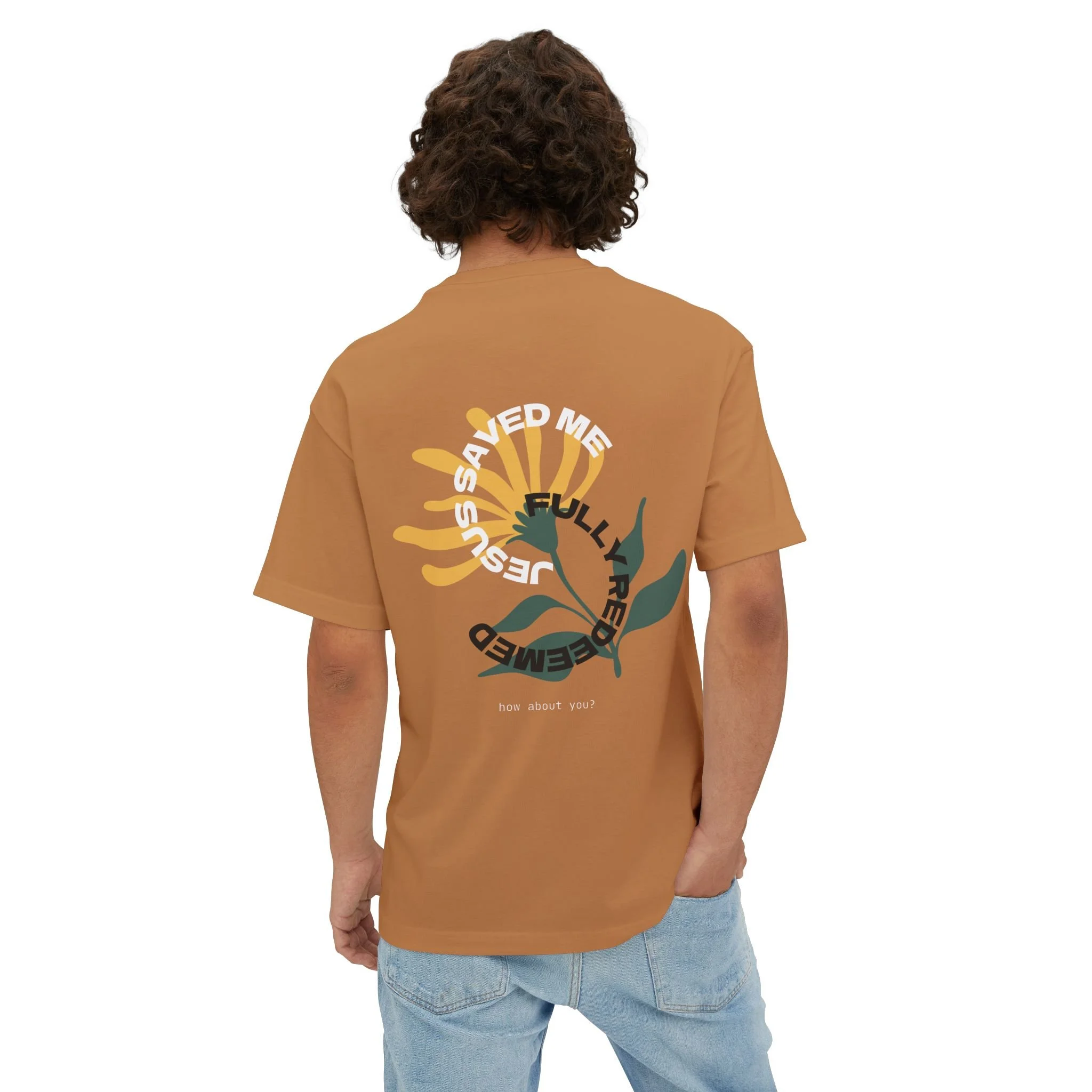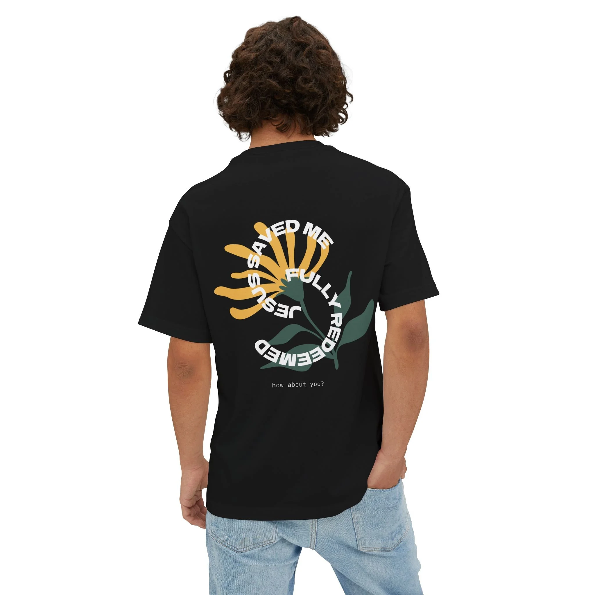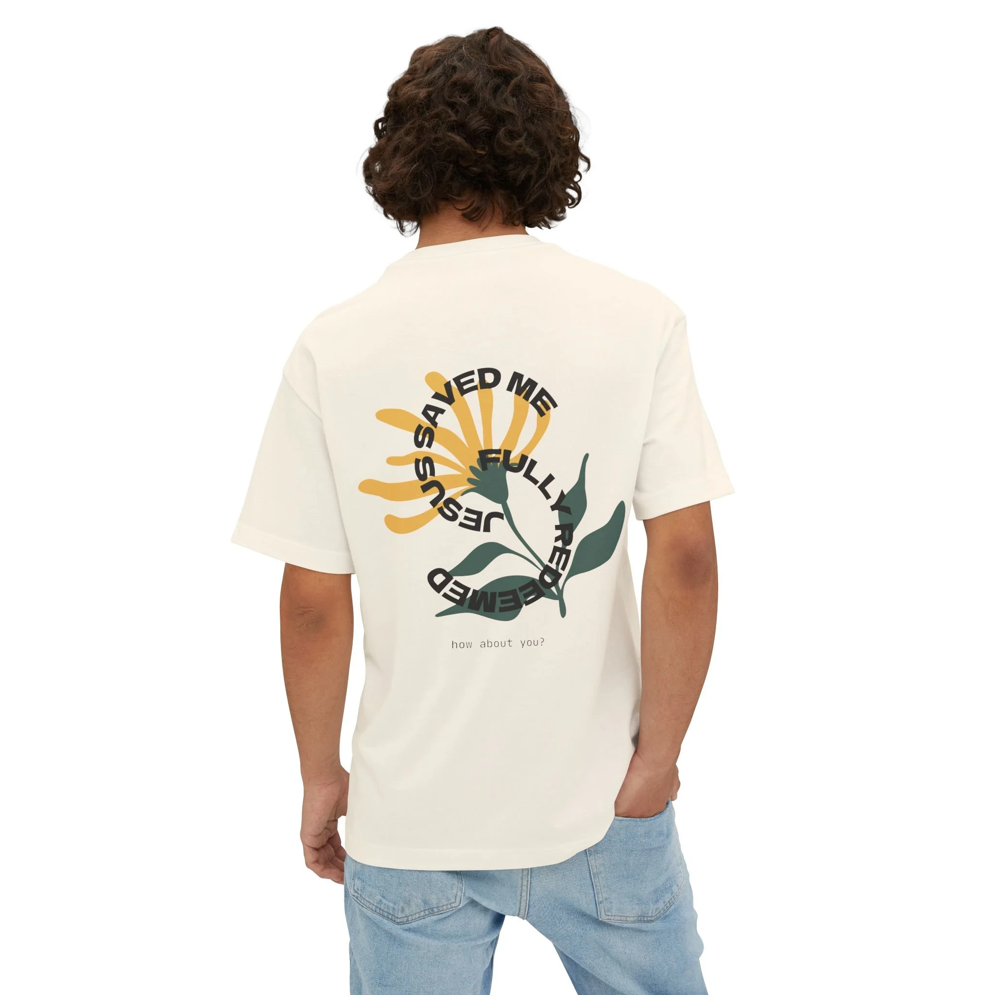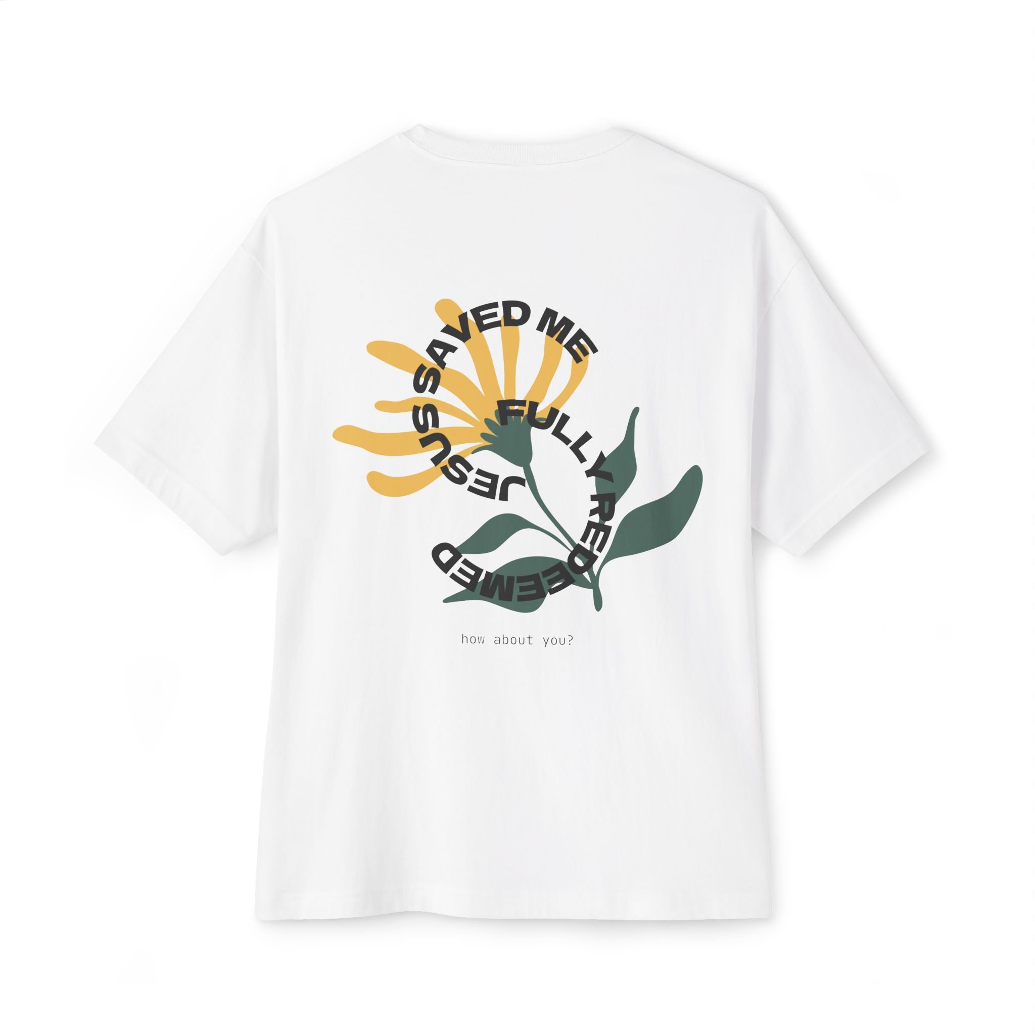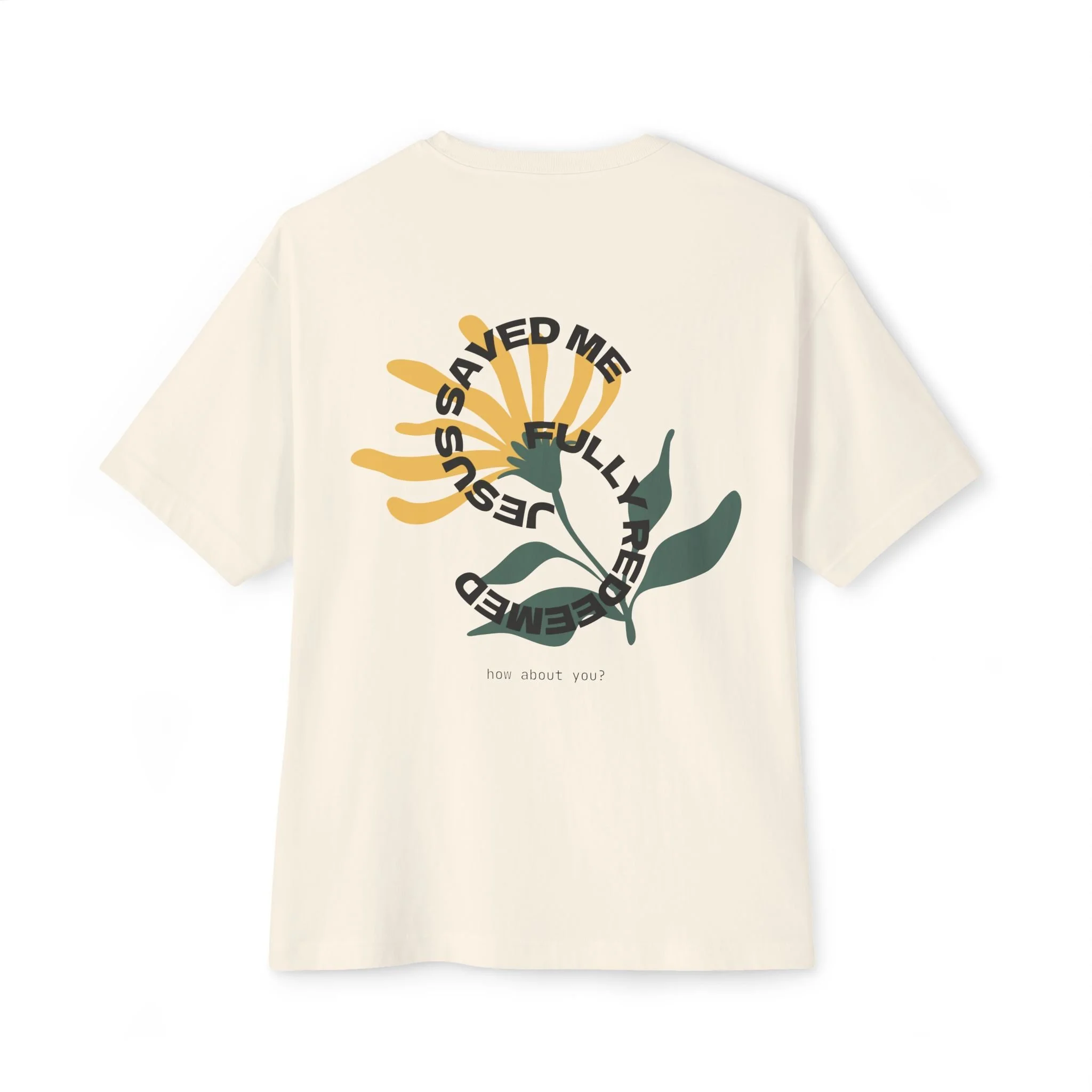 A relaxed, oversized tee that reads like a quiet reminder. The soft, midweight cotton falls with a boxy silhouette and dropped shoulders for an easy, lived-in look. A minimalist circular print sits low on the chest — the phrase arcs around like a small emblem, with a subtle scripture detail beneath — giving the shirt a gentle, intentional vibe rather than shouting for attention. Wear it with worn denim, layered under an open shirt, or tossed over leggings for slow mornings, evenings around a small group, or when you want a simple statement of faith woven into everyday life.