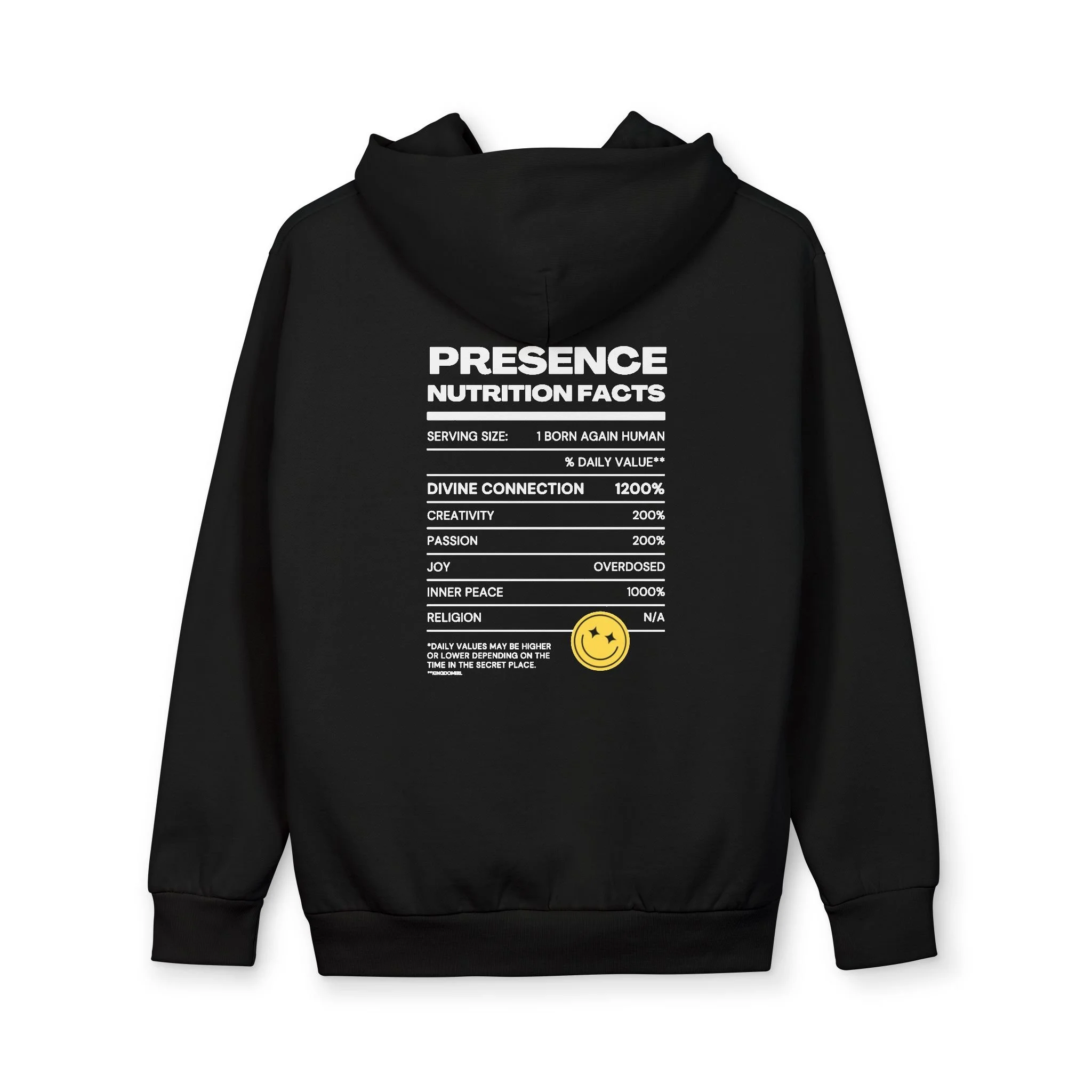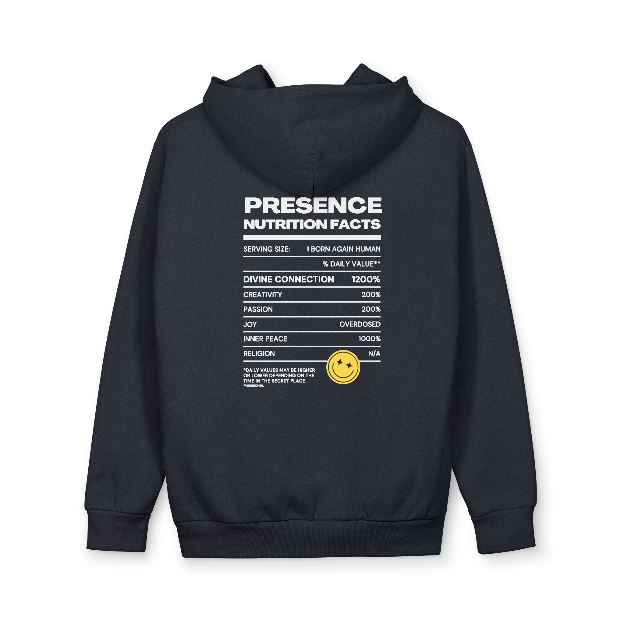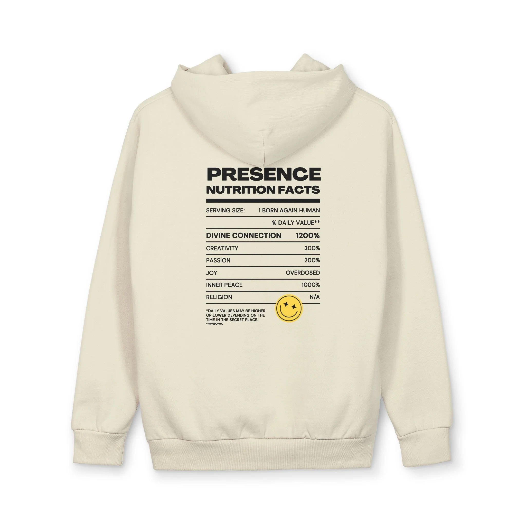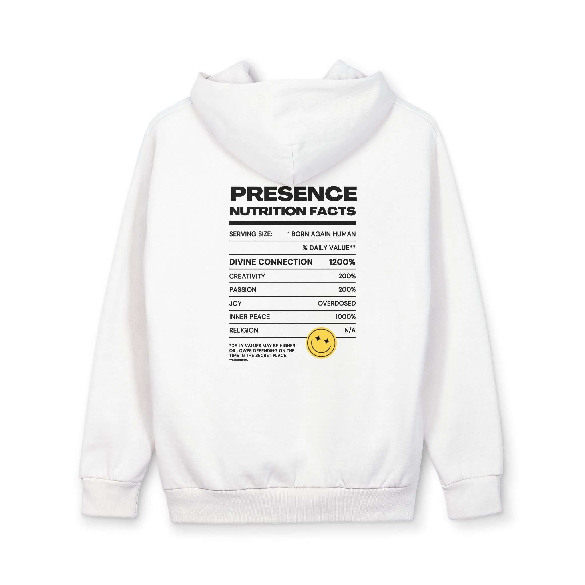 This oversized pullover hoodie wraps you in a calm, confident presence. Clean white fabric, a tiny embossed smiley on the chest, and a bold, typographic “Presence — Nutrition Facts” panel on the back give it a modern, streetwise edge. The heavy, double-layer hood sits smooth and structured without a drawstring; ribbed cuffs and waistband keep the silhouette grounded while the roomy fit layers easily over tees and flannels. Wear it on slow mornings, late-night walks, or busy studio days — it reads like a quiet declaration: you’re here, steady, and unbothered.